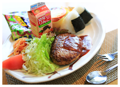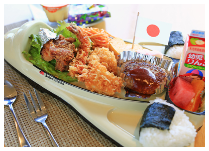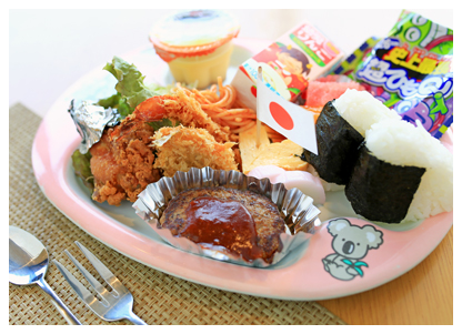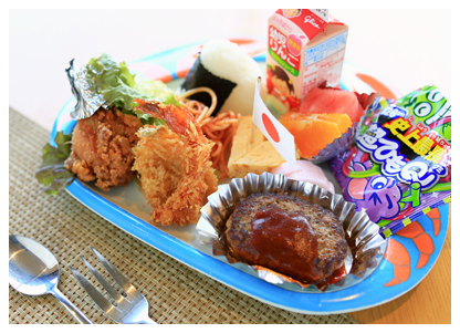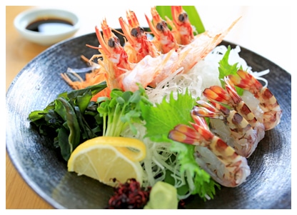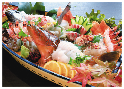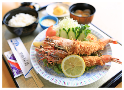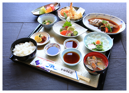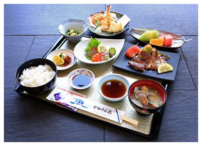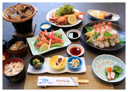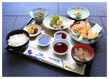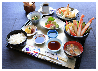 小鉢・刺身・天ぷら・カニサラダ・貝汁・御飯・食後アイスクリームまたはコーヒー