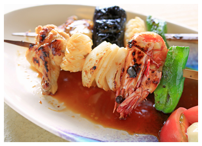 前菜・おどり・塩焼・酢物・揚物・あさり磯焼・貝汁・御飯・果物